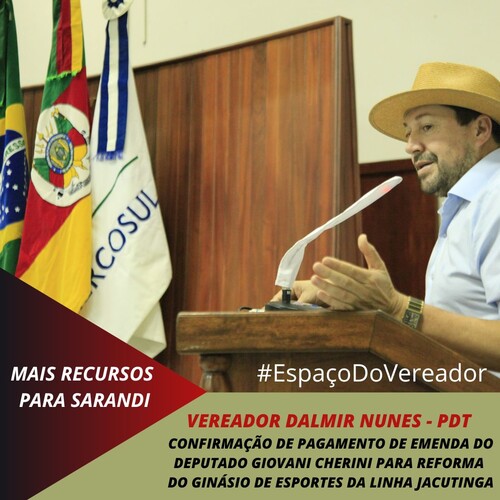 A conquista de recursos para reforma do ginásio da linha Jacutinga, é motivo de satisfação ao povo daquela comunidade, também ao vereador Dalmir Nunes da Bancada do PDT, que tanto tem trabalhado na busca destes recursos. Anunciamos mais uma ótima notícia, a Emenda parlamentar no montante de R$125 mil que foi prometida pelo Deputado Federal Giovani Cherini(PL) para reforma do ginásio de esportes da Linha Jacutinga já foi paga em 01 de julho.