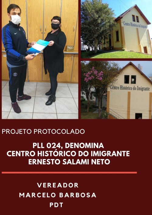 Na tarde da última quinta-feira(20), foi protocolado na secretaria da Casa Legislativa o Projeto de Lei do Legislativo nº024, com o objetivo de prestar homenagem o saudoso Senhor Ernesto Salami Neto pelos relevantes trabalhos prestados a comunidade Sarandiense. Os Parlamentares Marcelo Barbosa, Aírton Ortiz, Wilmar José de Azeredo, Dalmir Nunes e Jairo Corso, integrantes da bancada do PDT, criaram o PLL nº024, que denomina o centro histórico do imigrante com o nome de Ernesto Salami Neto. O homenageado, em toda sua vida teve forte atuação em movimentos religiosos, participando também da formação da Comunidade do Bairro Santa Catarina, viabilizando as áreas para a construção da Igreja daquela comunidade e o campo de futebol, contribuiu para o desenvolvimento do nosso Município.