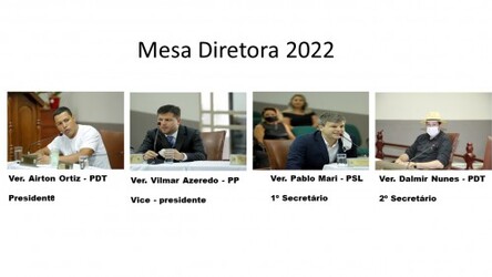 Os vereadores da Câmara Municipal de Sarandi elegeram na última segunda-feira (13/12) os novos membros da sua Mesa Diretora – órgão responsável pela direção dos trabalhos do Poder Legislativo municipal. Por maioria de votos, a nova Mesa será composta pelos vereadores Airton Ortiz (PDT) como Presidente; Vilmar Azeredo (PP) como Vice-Presidente; Pablo Mari (PSL) como 1º Secretário e Dalmir Nunes (PDT) como 2º Secretário. Os eleitos serão automaticamente empossados a partir de 1º de janeiro de 2022. Conforme rege o Regimento Interno da Casa da Cidadania, o mandato da Mesa é de um ano.